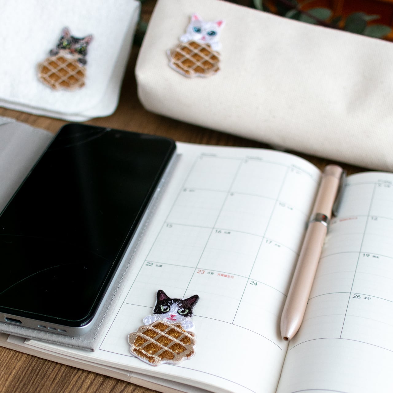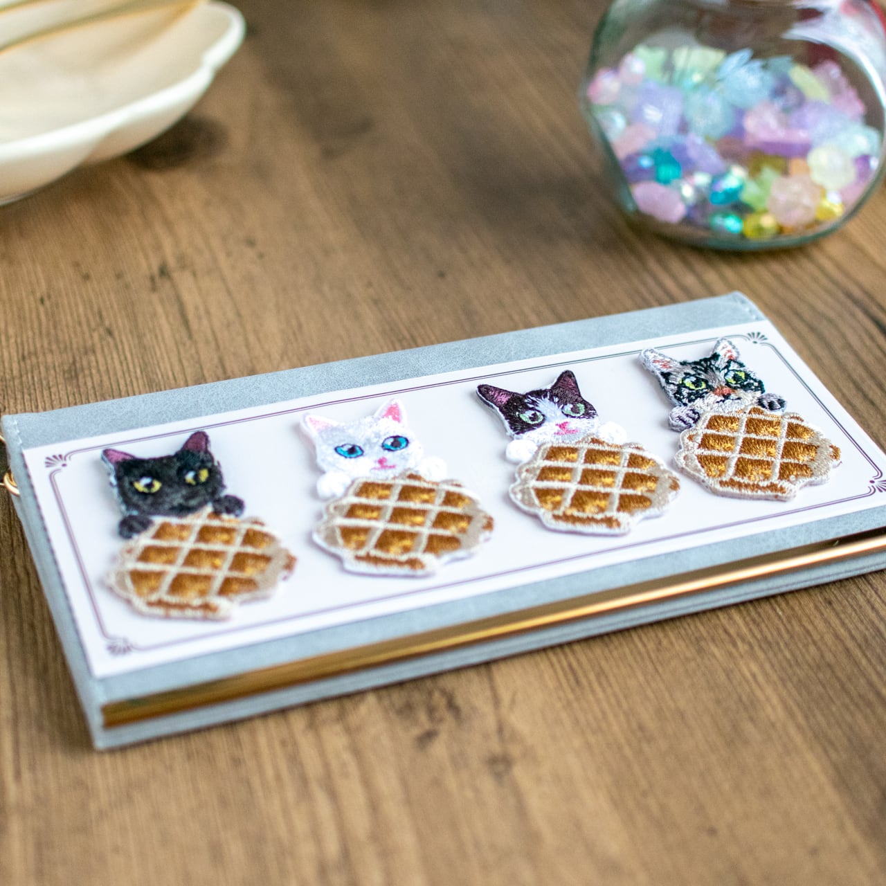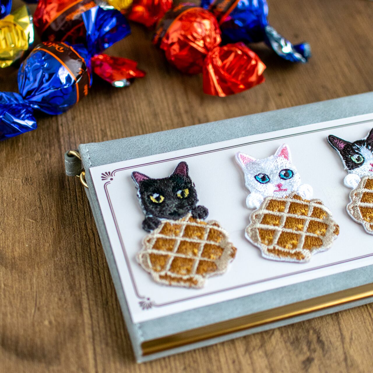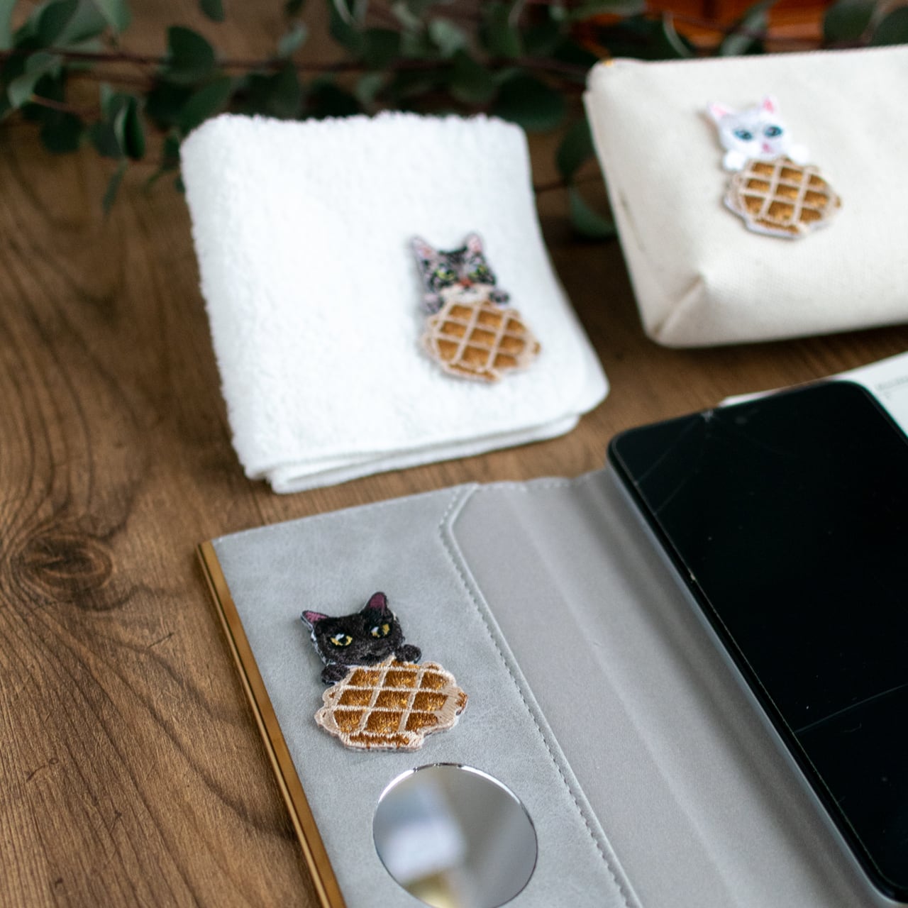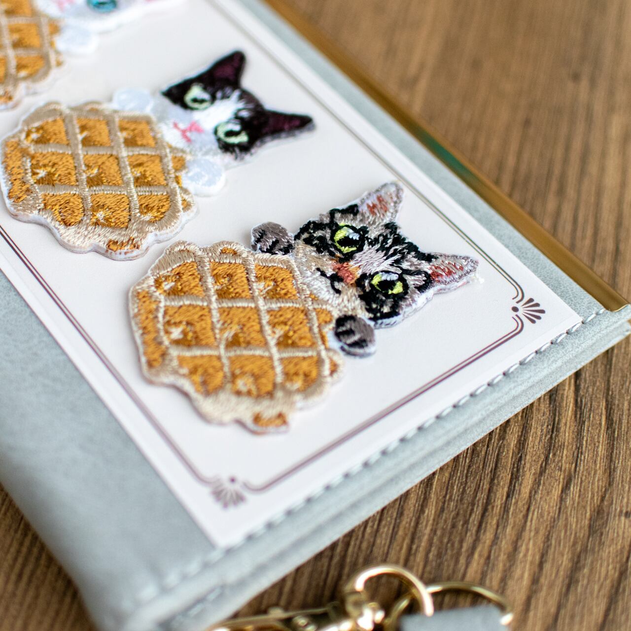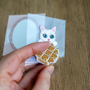 猫の毛並みを細やかな刺繍で表現し、ワッフルのデコボコした形までしっかり感じられます。