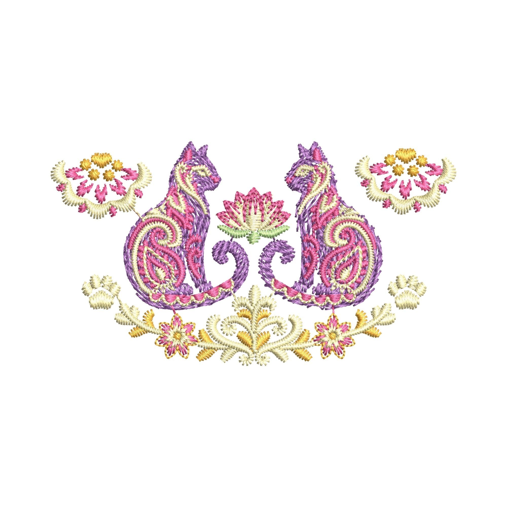 【刺繍データ販売】猫華文様エスニック刺繍リボン / つなげて使える刺繍モチーフ 【 M013-1_EthnicCat-&-FloralRibbon_JP.zip 】